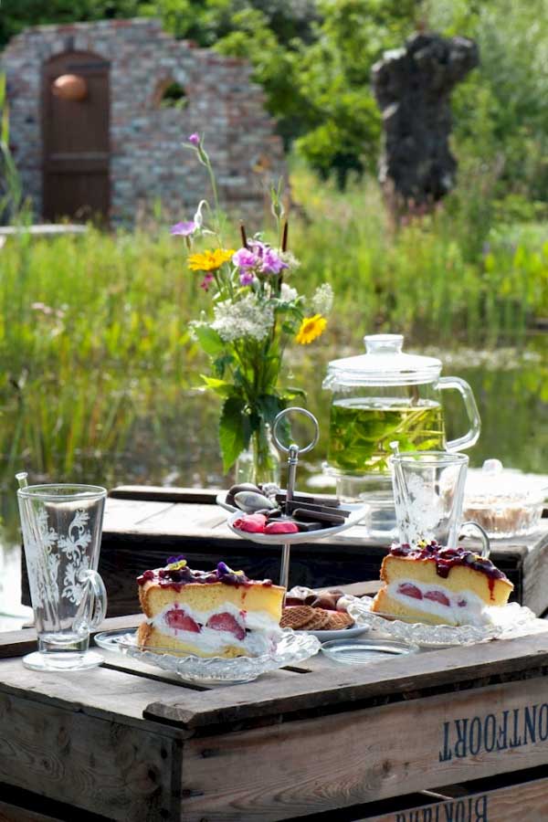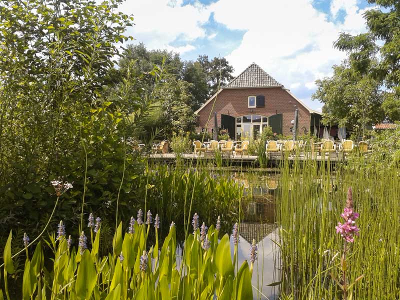 In de theeschenkerij van NatuurlijkBUITEN serveren Anna en Aart biologische thee en koffie en bakken eigen cakes en taarten. ‘s Ochtends is hier ook het ontbijt, met kakelverse eitjes en geurende warme broodjes. Voor de 'Taart van Aart' komen bezoekers graag terug! Vanaf het terras kijk je over het water en de natuurtuin uit.