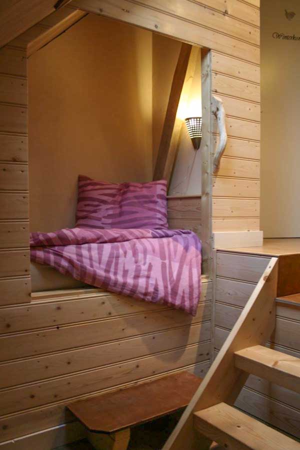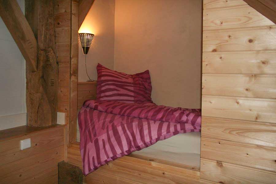 Binnen, in de boerderij, hebben Anna en Aart een sfeervolle Bed en Breakfast en theeschenkerij gemaakt. Op de zolder met oude eiken gebinten zijn vier kleine, maar sfeervolle kamers, voor twee personen. Je slaapt in een gezellige bedstee. In de kamer Steenuil en Groene Specht zijn een douche en toilet aanwezig. Voor de kamers Roodborstje en Winterkoning is er een douche en toilet op de gang. Ook is er een sfeervol vakantiehuisje voor twee personen op het erf.