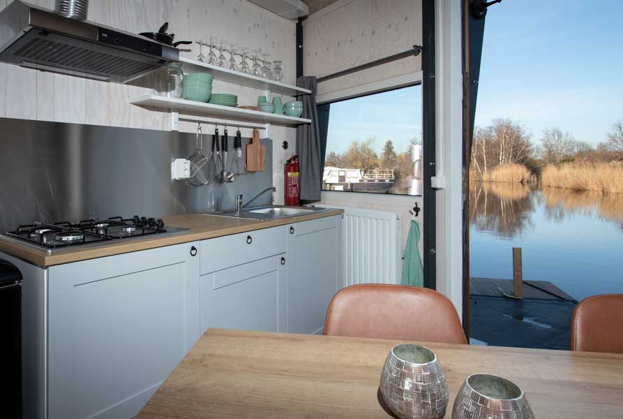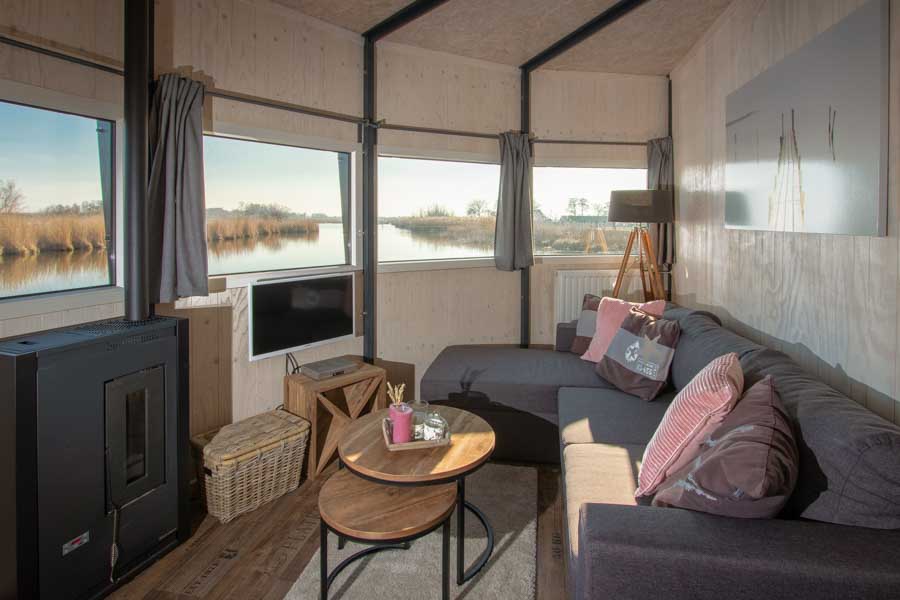 Het Dobberhuisje is ‘tiny’ maar toch heel erg compleet. Een woonkamer met een comfortabele bank en een pelletkachel. Vanuit de verrassend complete keuken stap je zo naar buiten op de steiger. Eén slaapkamer heeft een luxe tweepersoons boxspring en in de andere slaapkamer staat een stapelbed en een éénpersoons boxspring. Wil je graag een verzorgd ontbijt of een lekkere lunch? Ook dat kan, in het restaurant aan het begin van de jachthaven.