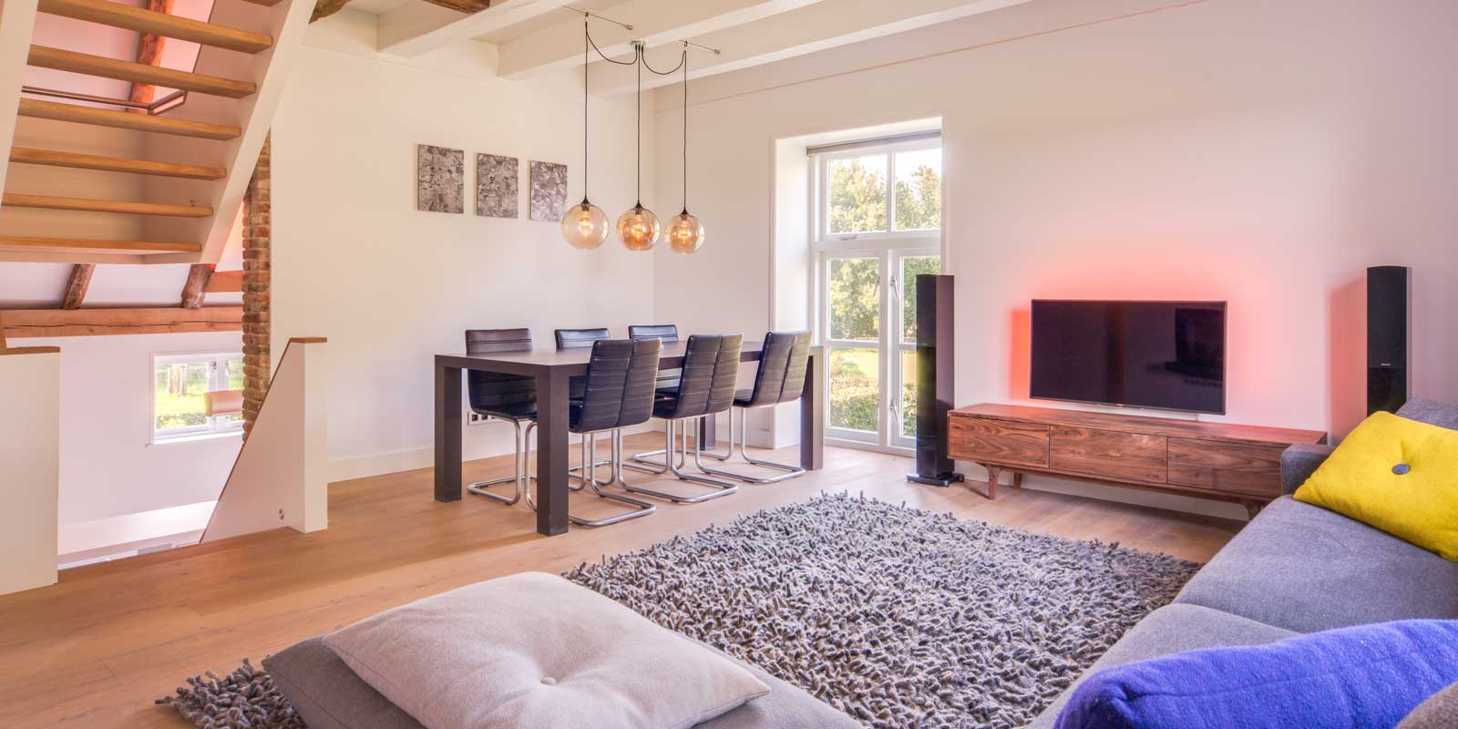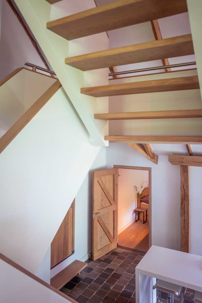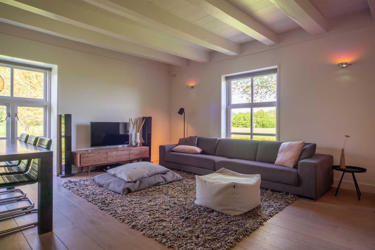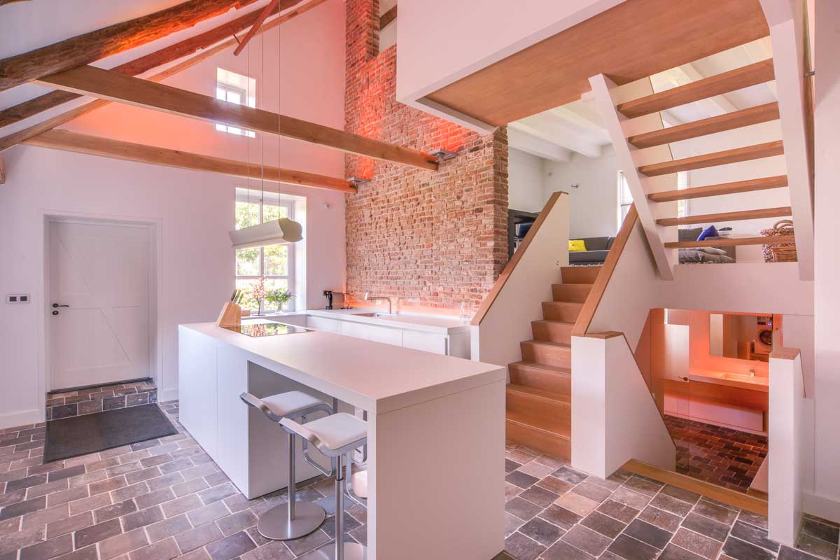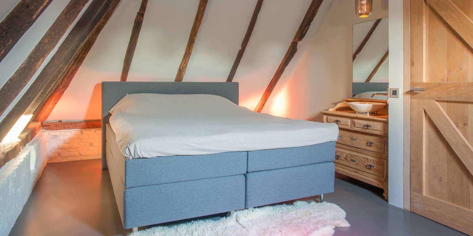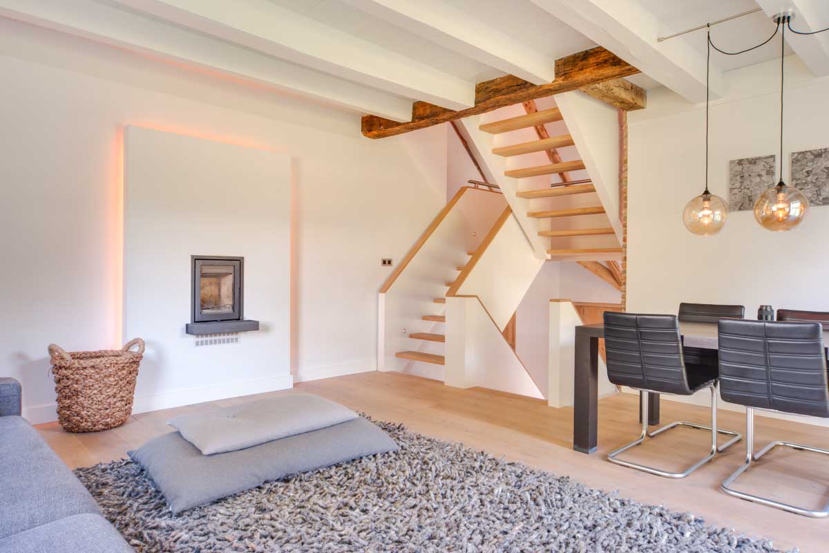 In het voorhuis is het gastenverblijf, verdeeld over vier niveaus die via een open trap met elkaar zijn verbonden. De hoge open ruimtes en sfeervolle kleurenverlichting zorgen voor een bijzondere beleving. De oude opkamer is nu de woonkamer met een home cinema-systeem. De keuken met kookeiland is de perfecte plek om je eigen diner te maken. Op de bovenverdieping, onder de oude handgezaagde sporenkap, vind je twee slaapkamers. Op de begane grond is de derde slaapkamer. In de kelder is een wellnessruimte met infrarood sauna, regendouche en bad.