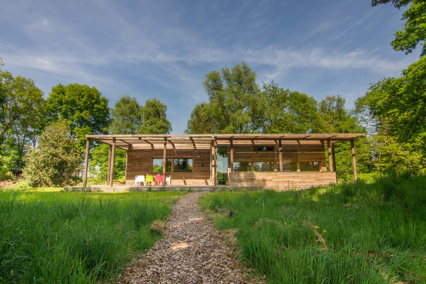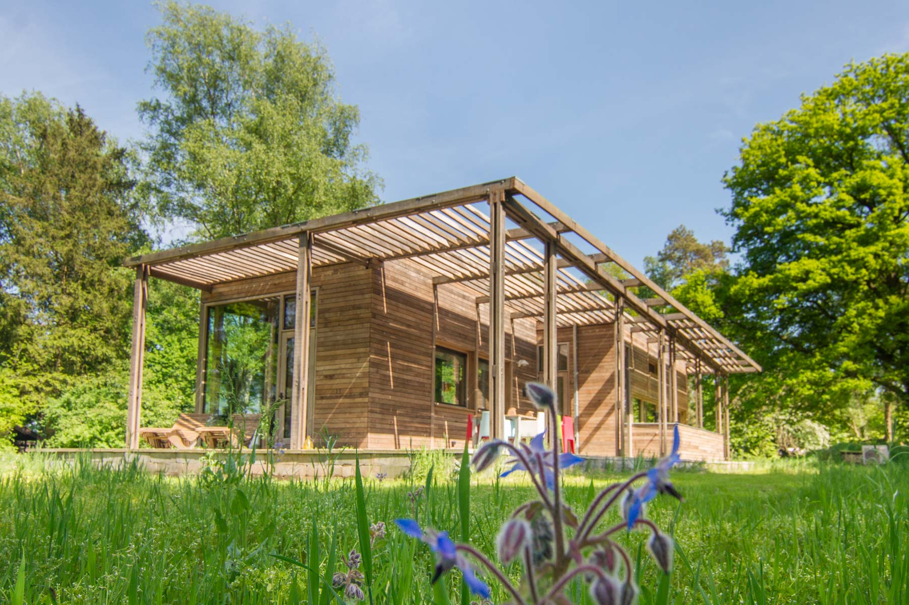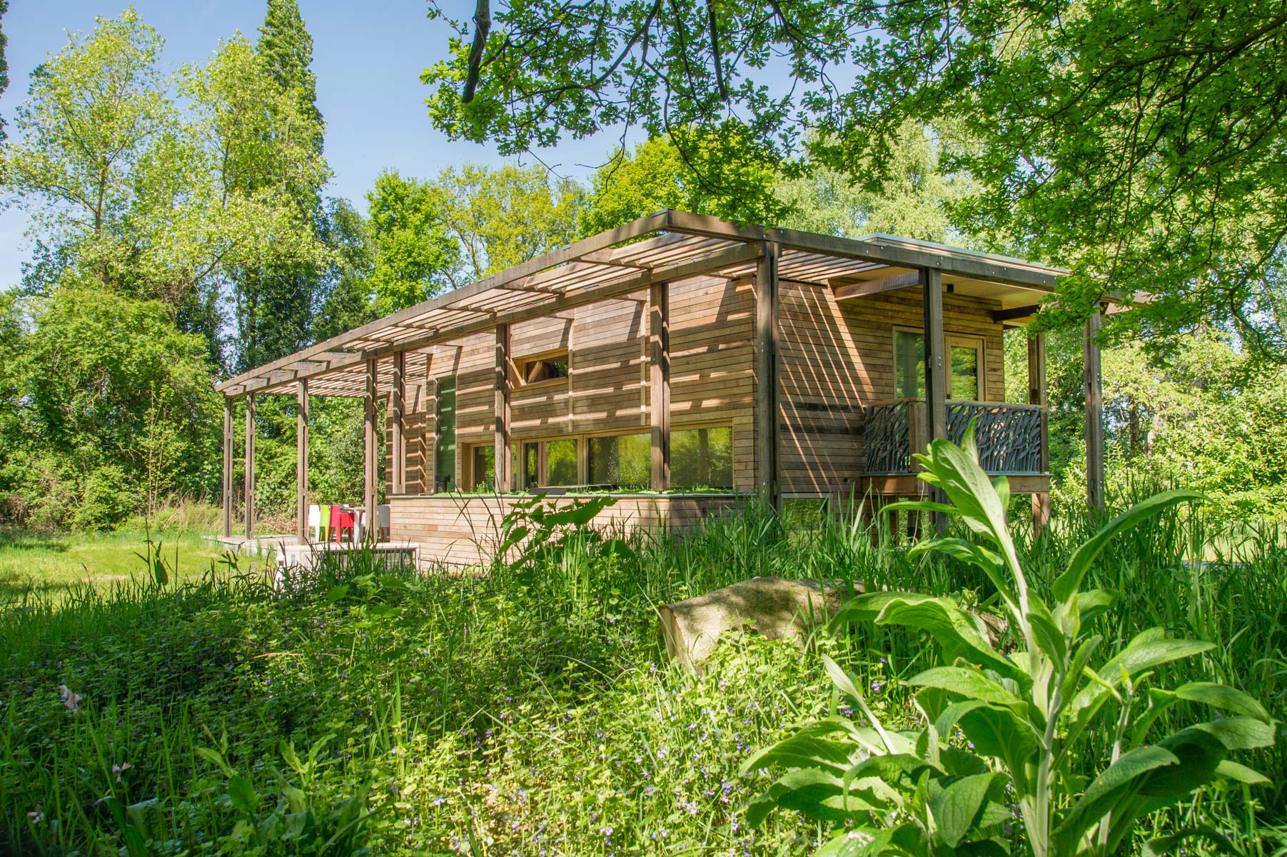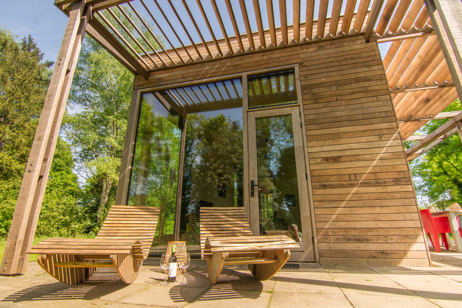 Een stijlvol eco paviljoen op een weelderige es