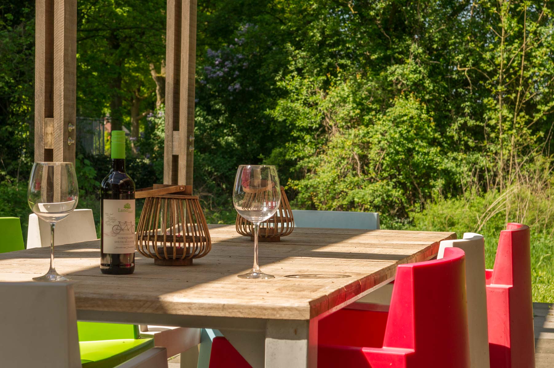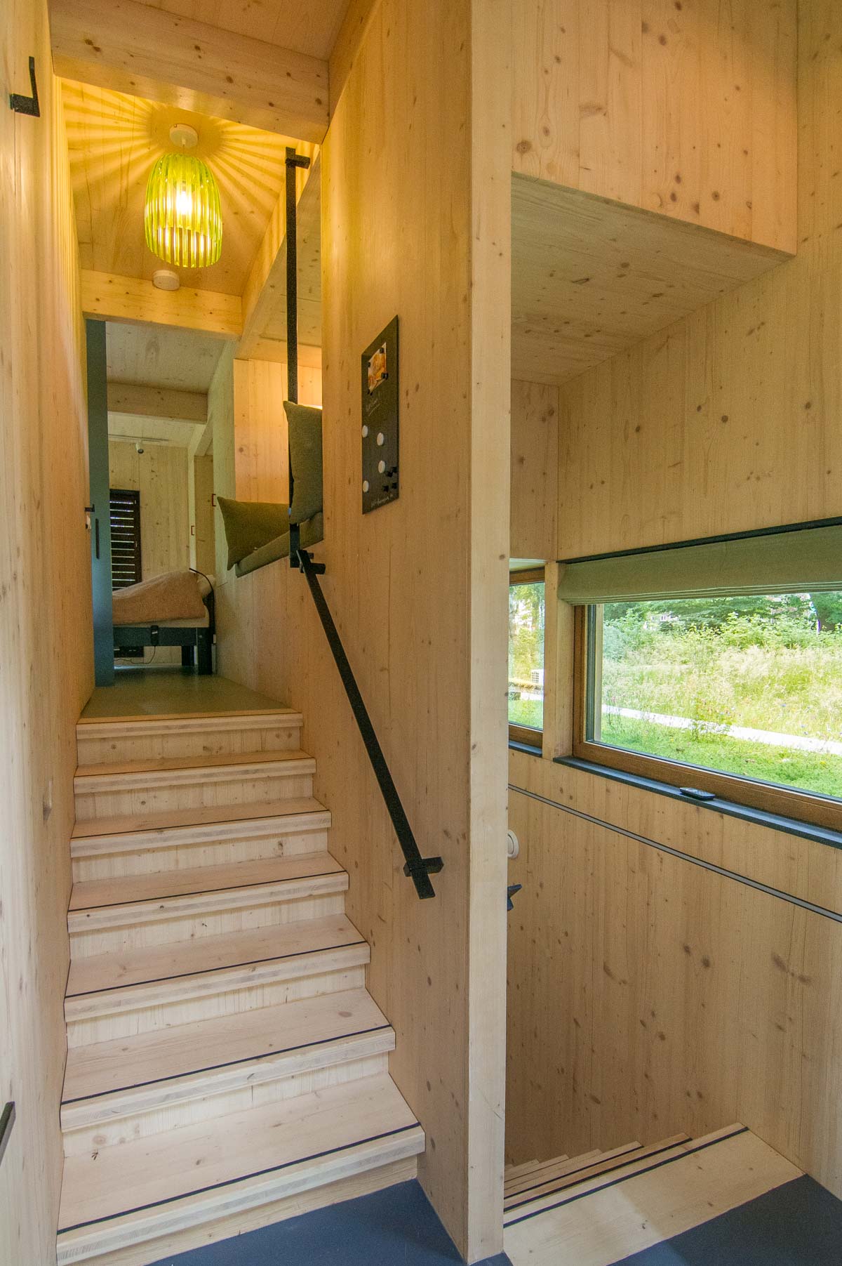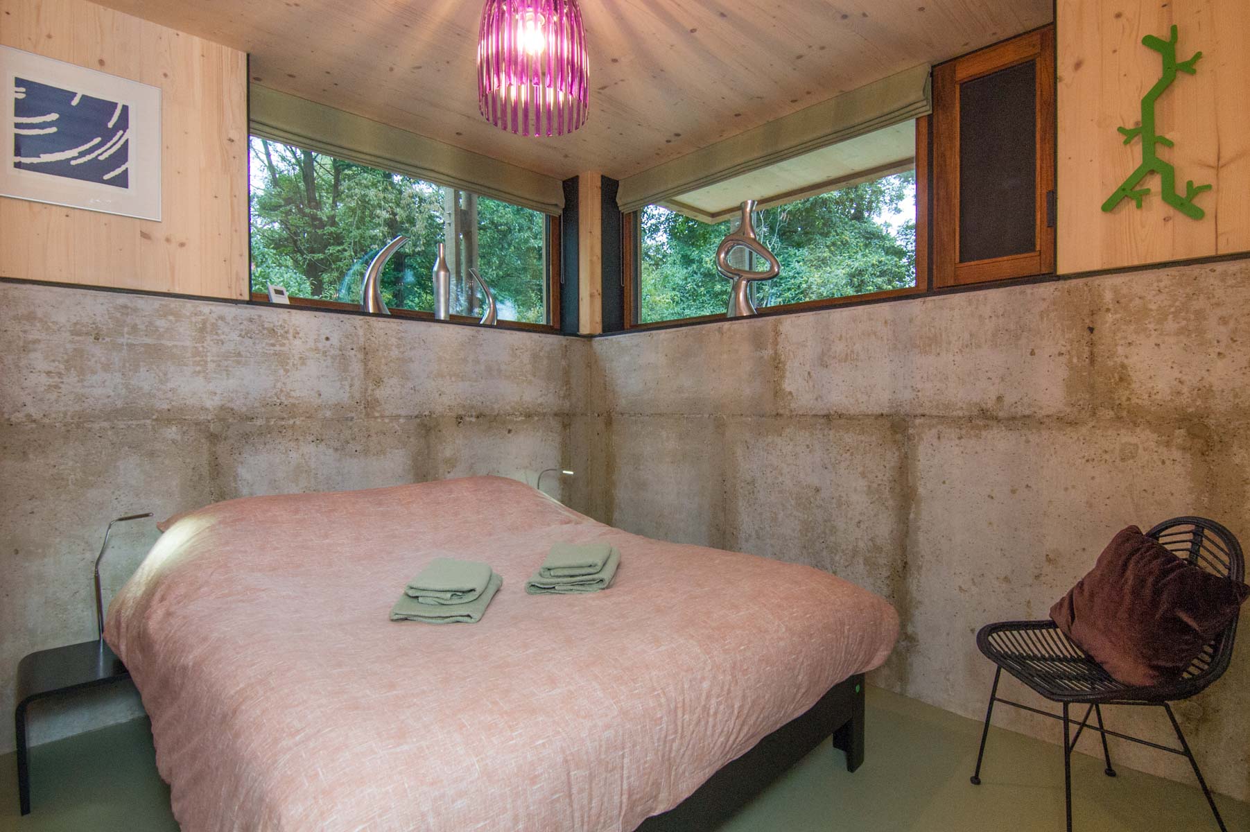 Paviljoen Esch is een stijlvol eco vakantiehuis aan een eeuwenoud zandpad op een weelderige es. In de linkervleugel van het paviljoen kun je met een paar traptreden omhoog naar de bel-etage of naar beneden naar het souterrain. Waar de linkervleugel als een ingewikkelde puzzel in elkaar zit, is de rechtervleugel juist één ruimte met een hoge living van bijna vier meter hoog.