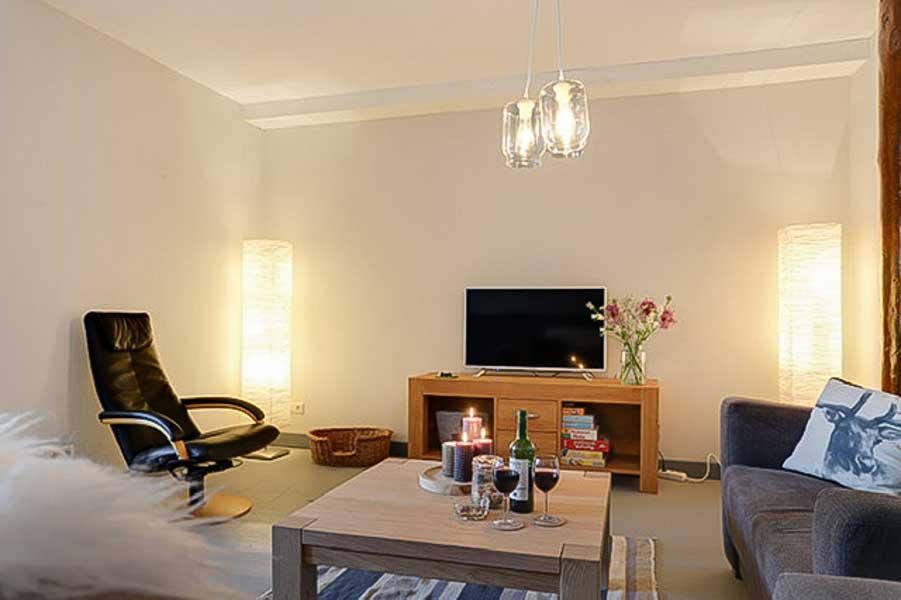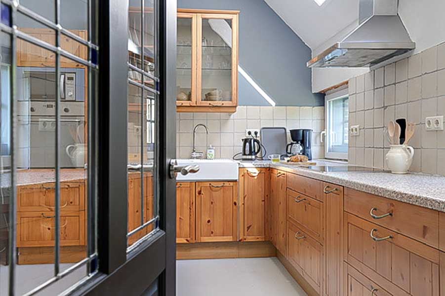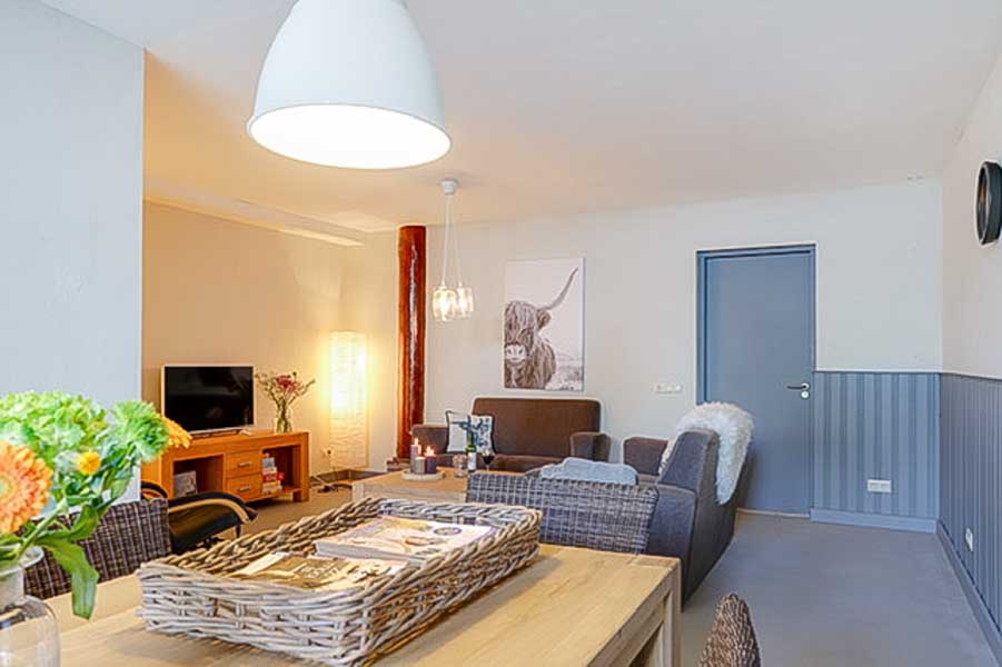 Vanuit de gang kom je in de ruime, lichte en goed uitgeruste keuken. Het is goed toeven aan de ruime eettafel. Ook is er een knusse zithoek met smart tv. Boven zijn er twee slaapkamers. In de grote slaapkamer staat er een ruim tweepersoonsbed en een ledikantje. Vanuit deze kamer loop je ook naar de tweede slaapkamer met twee eenpersoonsbedden. Bij de vide staat een luxe slaapbank voor twee personen. De luxe badkamer heeft een inloopdouche, ligbad en tweede toilet.