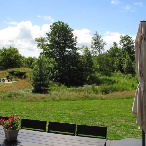 Om het huis ligt een grote tuin, met veel privé, omgeven door boomsingels en hagen. Vanuit de woonkamer en terras kijk je uit op een grote vijver. Naast de vijver zijn een groot en een klein terras aangelegd.