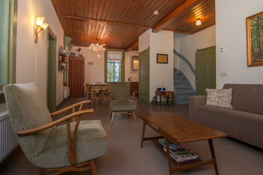 Ook zijn er veel vintage meubels en lampen hergebruikt zodat je historie in het pand voelt maar ook omdat het hartstikke duurzaam is. De bank is nieuw gekocht direct bij de meubelmaker vanuit een restpartij. Op de vloer beneden ligt natuurlijk marmoleum. Voor alles wat aan vervanging toe is kiezen we zoveel mogelijk voor hergebruikt of ecologisch. Bijvoorbeeld een vliegengordijn van gedroogde maisbladeren en een verduisterend rolgordijntje van 100% gerecycled materiaal. De bedden van hotelkwaliteit zijn grotendeels circulair en het beddengoed is van ecologisch katoen.